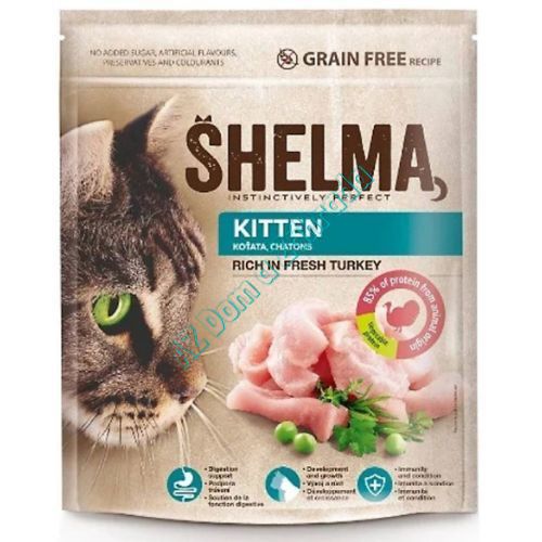 Shelma Kitten granule s čerstvým morčacím mäsom je kompletné a nutrične vyvážené krmivo pre mačiatka, navrhnuté pre zdravý rast, vývoj kostí a optimálnu kondíciu. Receptúra bez obilnín s vysokým podielom mäsa poskytuje dostatok kvalitných bielkovín (85 % proteínov zo živočíšnych zdrojov) pre budovanie svalovej hmoty.