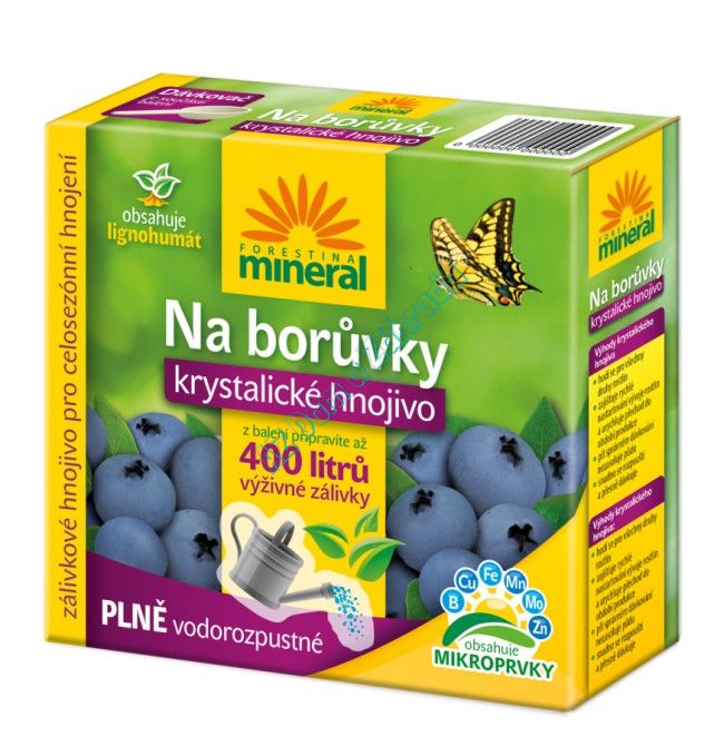 Mineral s Lignohumátom na čučoriedky je vo vode rozpustné kryštalické hnojivo s vysokým obsahom fosforu a draslíka, obohatené o lignohumát a mikroprvky. Neobsahuje vápnik, takže je ideálne pre všetky kyslomilné rastliny, ako sú čučoriedky, rododendróny, azalky, vresy, kalmie či kanadské čučoriedky.