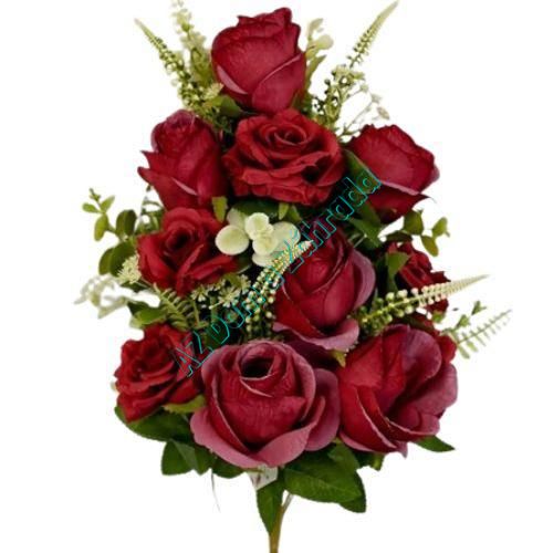 Bohatá ležiaca umelá kytica s 10 ružami, listovým doplnkom a dekoračnými kvetmi. Elegantné spracovanie, vhodné na výzdobu, vence, svadby aj smútočné dekorácie.