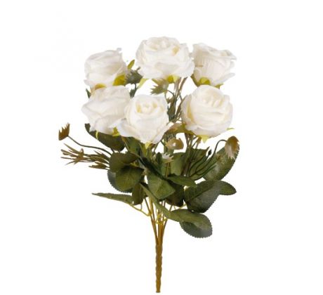Umelá kytička ružičiek v krásnej krémovej farbe má výšku 30 cm. Kvety sú vyrobené z hodvábnej textílie. Počet ružičiek je 6 s priemerom hlavičky ruže 5 cm.