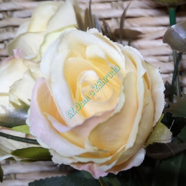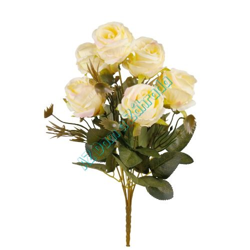 Umelá kytička ružičiek v krásnej žltej farbe má výšku 30 cm. Kvety sú vyrobené z hodvábnej textílie. Počet ružičiek je 6 s priemerom hlavičky ruže 5 cm.
