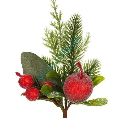 Dekoratívna vetvička s realistickými ihličnatými vetvičkami, listami, červeným jablkom a drobnými bobuľkami s efektom jemného mrazu. Ideálna na zimné a vianočné aranžmány, vencové dekorácie, svietniky či zdobenie darčekov. Pôsobí prirodzene a dodá priestoru elegantný sviatočný nádych.